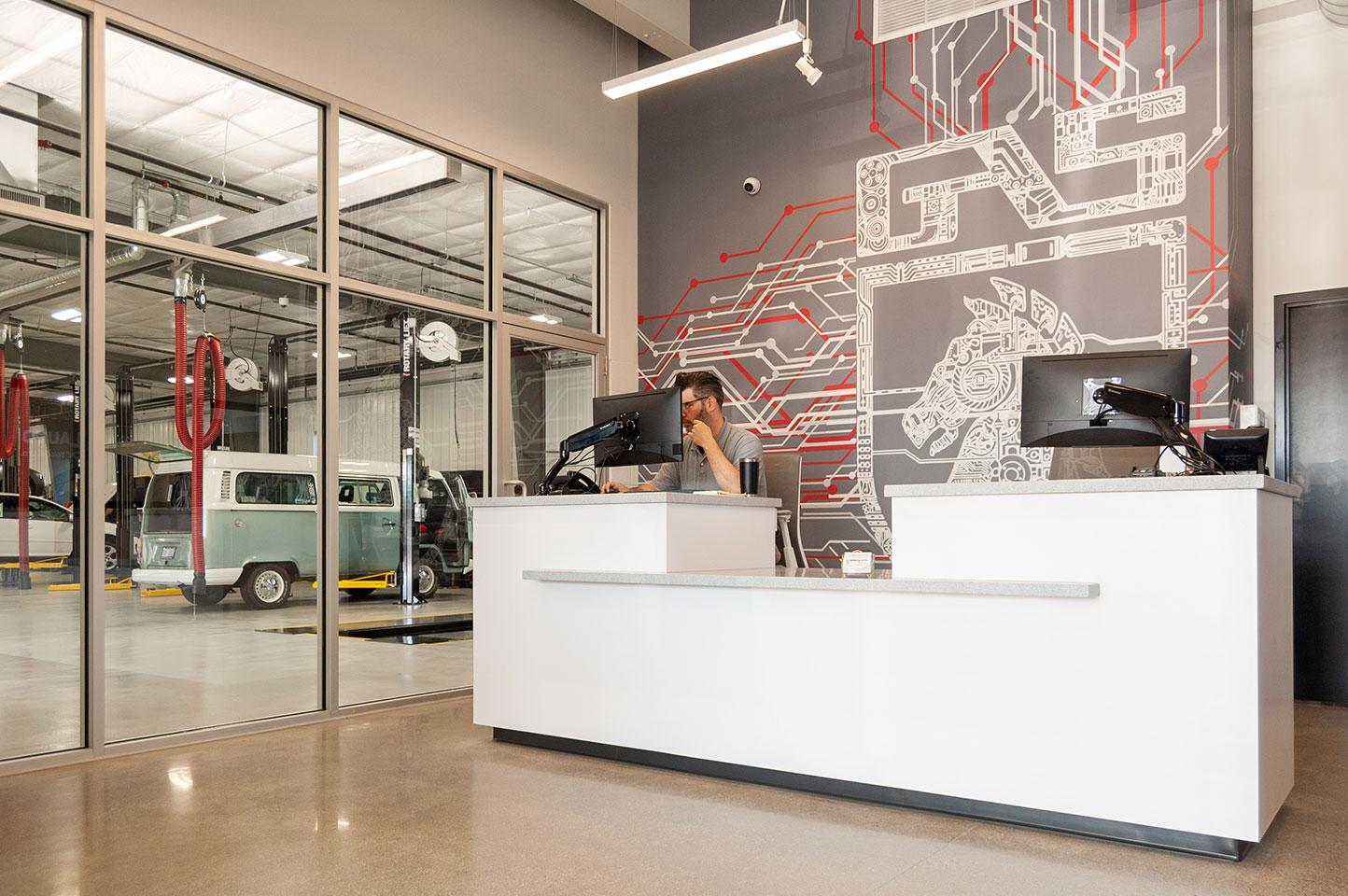 Located on Avastar Parkway near Alpine Avenue and Ann Street, the new facility embraces the bold, industrial architecture of a high-performance service garage. The design intentionally puts the shop on display — customers in the lobby have clear views of the service area and the team at work. Inside, an open-concept customer service area features a large, eye-catching graphic and a bright, engaging environment that reflects the energy and expertise of German Auto Service.