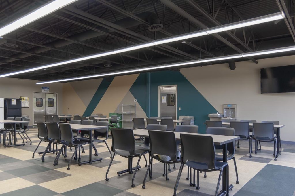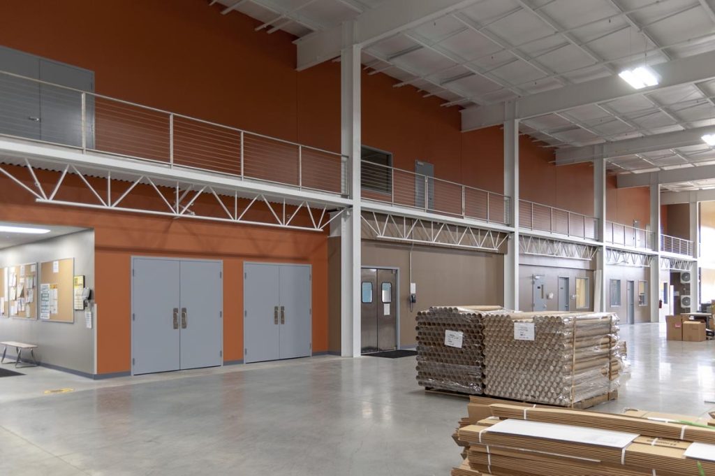 ROI Design led the interior design of the new 100,000 SF facility — a nearly $8 million project. The new facility features a striking open staircase in the lobby, a bright and welcoming break room, and vibrant colors throughout the manufacturing area — a design choice that was initially unexpected but ultimately celebrated for energizing the space.