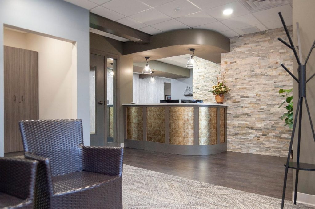 ROI Design worked with Dr. Miller to create an interior that feels both natural and modern. The space is warm and welcoming, featuring a mix of light and dark paint contrasts, darker wood flooring, stone accents, and a custom reception desk. ROI Design also provided new lobby furniture, carefully selected to complement the finishes and create a cohesive, polished look.