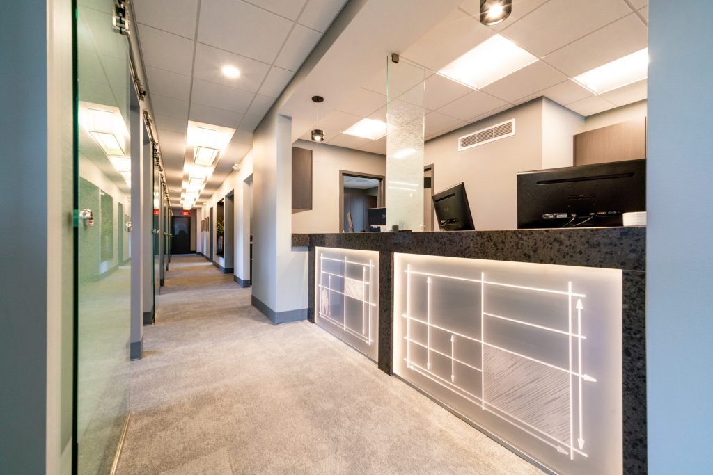 Blueprint Dentistry’s design elements reflect its brand. Playing off the logo and their dedication to precision dentistry, the lobby lighting is recessed linear LED that runs through the ceiling and continuously down the wall.
