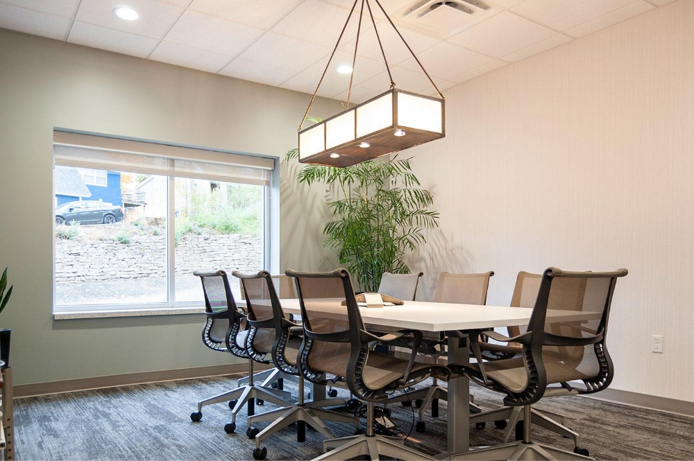The refreshed space blends function with personality—featuring recycled wood paneling, bold carpet patterns, and residential-style lounge furniture. With thoughtful design touches like a large kitchen island and a whiteboard-filled, UCS now has a workspace that supports their growing team and reflects their long-standing presence in West Michigan.